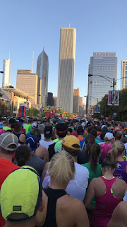 Gear drop off was no problem, easy to find, easy to handle. I was expecting the temps to be a little cooler than what it was and had packed plenty into my bag. I was planning on meeting up with my family right after, but I'm definitely guilty of being a "what if" worrier. So, what if it was pretty chilly when I finish? What if I can't find my family? I'm going to be wet (from sweat) and cold. In hindsight it was likely a little left over worry from when it was SO COLD at Boston and how I had under dressed and was under prepared for that finish. I also had worn throw away sweats to the start, but even though there was a little chill in the air, it wasn't that cold and I ended up putting my throw away stuff into my gear drop bag. Chicago definitely gives you a really big bag to put plenty in to and the bag is very functional and easy to handle before and after the race.